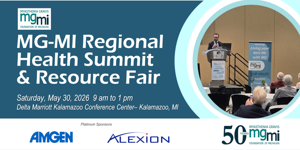 Patients, family, caregivers, educators and physicians will get in-person and on-line support and information about myasthenia gravis on Saturday, October 10, 2026, at 10 am to 3 pm at the Hilton Garden Inn Detroit/Novi. This is an in-person and virtual event.