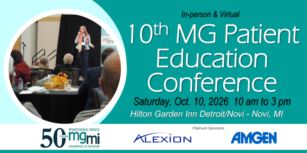 Patients, family, caregivers, educators and physicians will get in-person and on-line support and information about Myasthenia Gravis on Saturday, May 30, 2026, at 9 am to 1 pm at the Delta Marriott Kalamazoo Conference Center, Kalamazoo MI. This is an in-person and virtual event.
